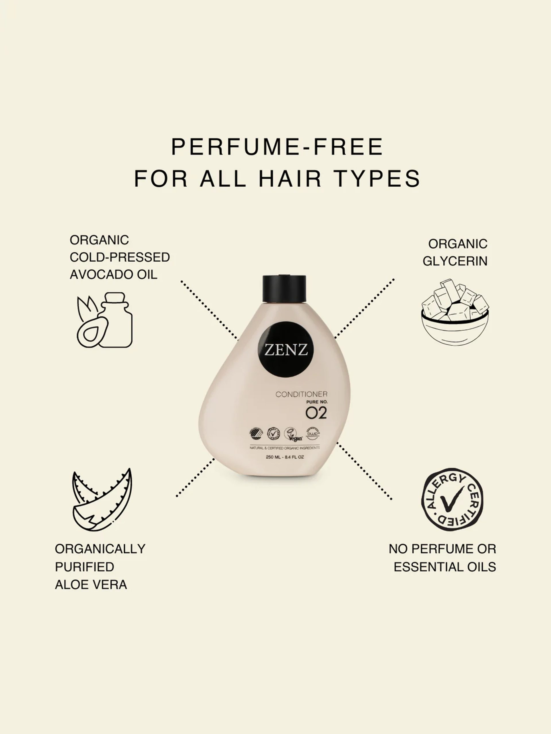 Conditioner Pure No. 02 enthält Gereinigte Bio-Aloe Vera, Bio-Glycerin und kaltgepresstes Bio-Avocadoöl.